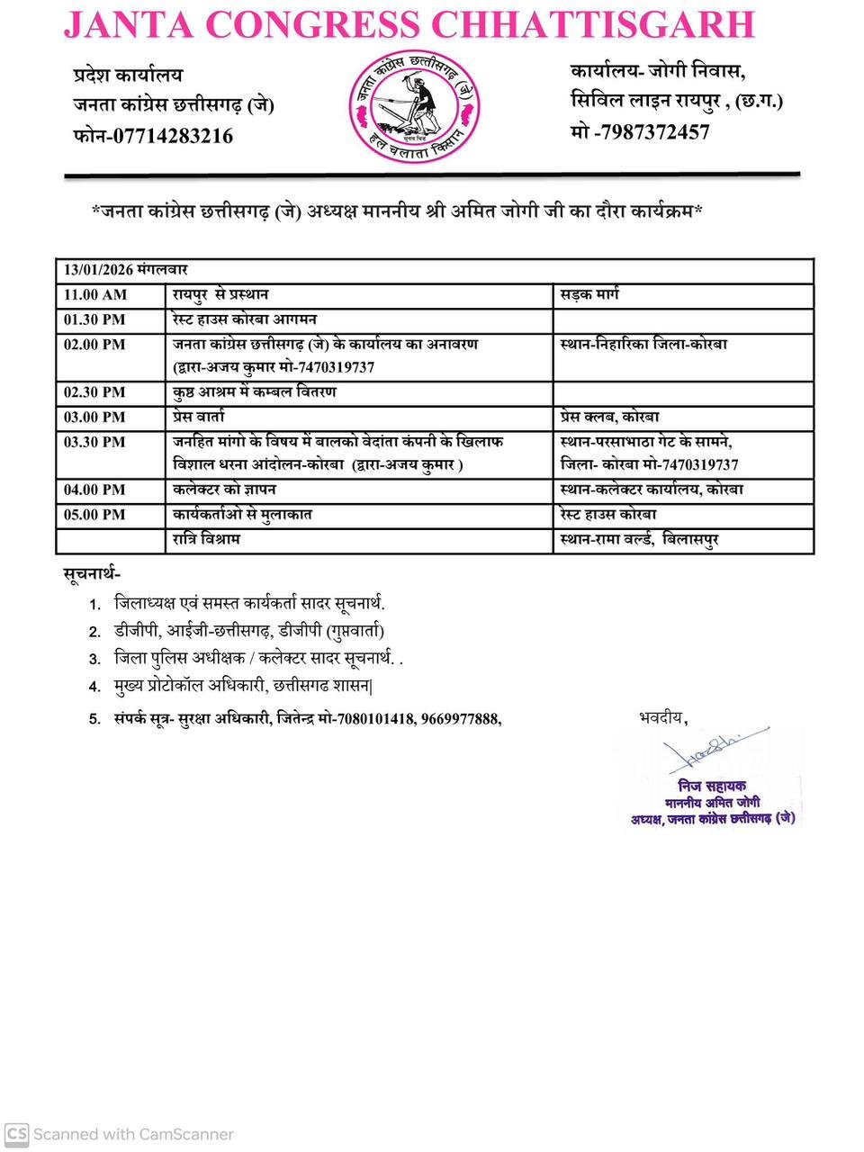 राजनीतिक कार्यक्रमों के साथ-साथ अमित जोगी सामाजिक कार्यों में भी शामिल होंगे। दोपहर 2:30 बजे वे स्थानीय कुष्ठ आश्रम पहुंचेंगे, जहां जरूरतमंदों को कंबल वितरित कर उनसे मुलाकात करेंगे। इसके पश्चात दोपहर 3:00 बजे वे कोरबा प्रेस क्लब में पत्रकारों से चर्चा कर प्रदेश की वर्तमान राजनीतिक स्थिति और स्थानीय समस्याओं पर अपनी बात रखेंगे।