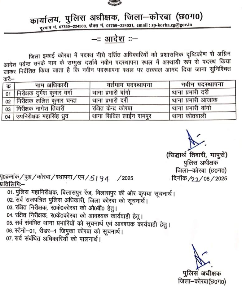 कोरबा ब्रेकिंग: TI सहित SI का तबादला, एसपी सिद्धार्थ तिवारी ने जारी किया आदेश, यहां देखें लिस्ट…कोरबा ब्रेकिंग: TI सहित SI का तबादला, एसपी सिद्धार्थ तिवारी ने जारी किया आदेश, यहां देखें लिस्ट…