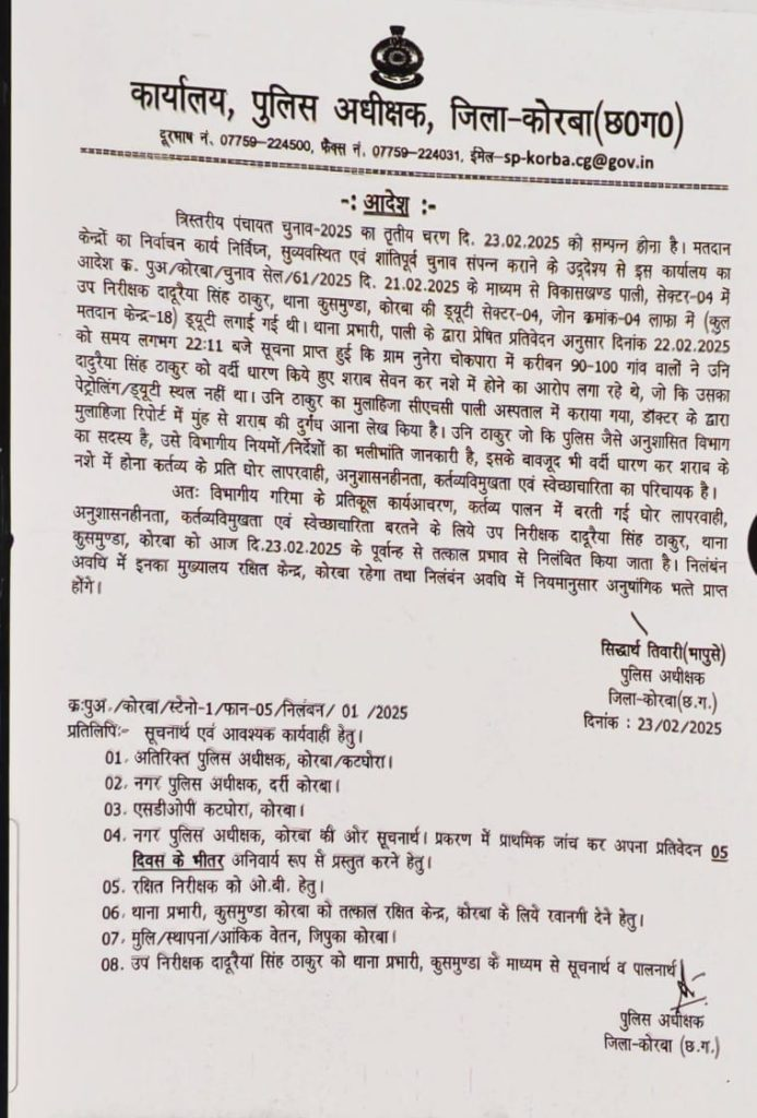 कोरबा। त्रिस्तरीय पंचायत चुनाव में तैनात मतदानकर्मियों के शराब के नशे में होने की लगातार खबरें सामने आ रही हैं, जिन पर कार्रवाई भी की जा रही है. वहीं कोरबा जिले में चुनाव ड्यूटी पर तैनात एक पुलिसकर्मी भी शराब के नशे में पाया गया, जिसे तत्काल प्रभाव से निलंबित कर दिया गया है. यह मामला पाली पंचायत के नुनेरा ग्राम का है, जहां ग्रामीणों ने ड्यूटी पर तैनात पुलिसकर्मी दादू मईयर को नशे की हालत में पकड़ा.