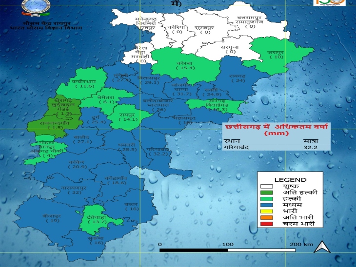 प्रदेश में अब तक 1168.7 मिली मीटर बारिश हो चुकी है, जो औसत से 5 फीसदी अधिक है। बीजापुर और बलरामपुर में अति भारी बारिश हुई है। बलौदाबाजार और सुकमा में औसत से अधिक पानी बरसा है।