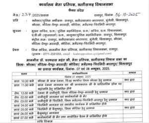 डॉ. महंत के इस प्रवास कार्यक्रम के तहत जनता से सीधा संवाद, स्थानीय मुद्दों की समीक्षा और विभिन्न सामाजिक व विकास परियोजनाओं का अवलोकन किया जाएगा। इससे क्षेत्रवासियों को अपने समस्याओं और अपेक्षाओं को सीधे नेता प्रतिपक्ष तक पहुंचाने का अवसर मिलेगा।
