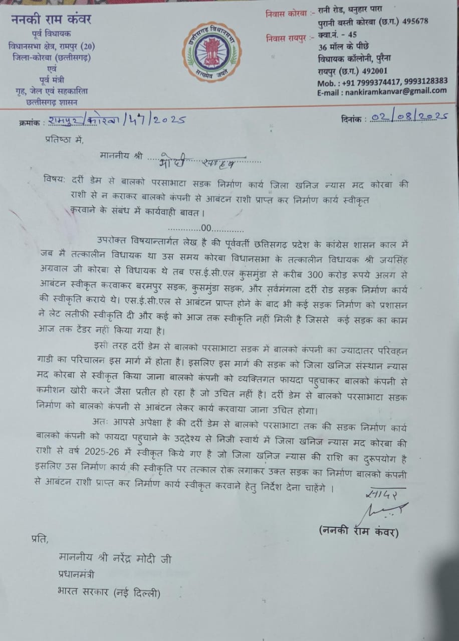 कोरबा। छत्तीसगढ़ के पूर्व गृहमंत्री ननकीराम कंवर ने दर्री डेम से बालको परसाभाटा तक सड़क निर्माण की स्वीकृति पर कड़ा विरोध जताया है। उन्होंने प्रधानमंत्री नरेंद्र मोदी, केंद्रीय कोयला एवं खनन मंत्री जी. किशन रेड्डी, मुख्यमंत्री विष्णुदेव साय और खनिज संसाधन विभाग के संचालक को पत्र भेजकर इस फैसले को अनुचित करार दिया है।
