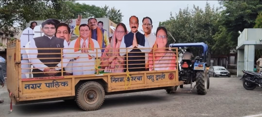 राज्योत्सव की तैयारी में बड़ी लापरवाही! पशु पकड़ने वाली ट्राली में ले जाए गए मुख्यमंत्री और मंत्रियों के कटआउट, निगम अफसरों पर गिरी गाज