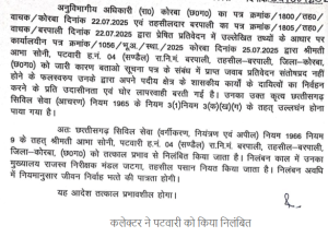 कोरबा, 5 अगस्त 2025।तहसील बरपाली अंतर्गत कार्यरत पटवारी आमा सोनी को शासकीय दायित्वों के निर्वहन में उदासीनता एवं घोर लापरवाही बरतने के आरोप में तत्काल प्रभाव से निलंबित कर दिया गया है। यह कार्रवाई कोरबा के अनुविभागीय अधिकारी (रा.) द्वारा की गई है।