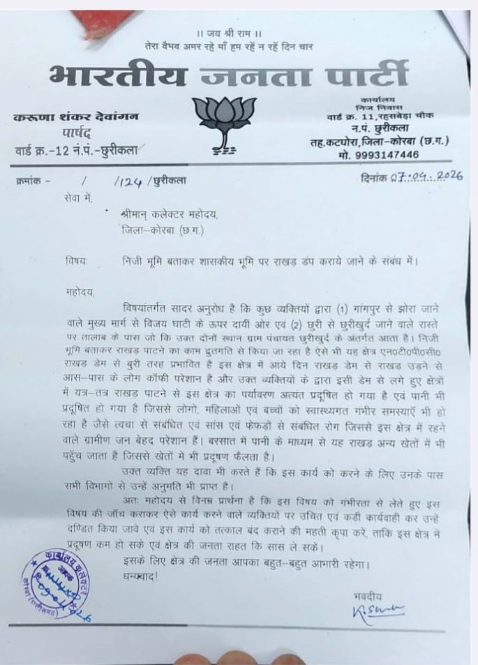 कोरबा। Korba जिले के छुरीकला क्षेत्र में शासकीय भूमि पर अवैध रूप से राखड़ डंप किए जाने का मामला सामने आया है। इस संबंध में वार्ड क्रमांक 12 के पार्षद करुणा शंकर देवांगन ने कलेक्टर को लिखित शिकायत सौंपकर जांच और सख्त कार्रवाई की मांग की है।