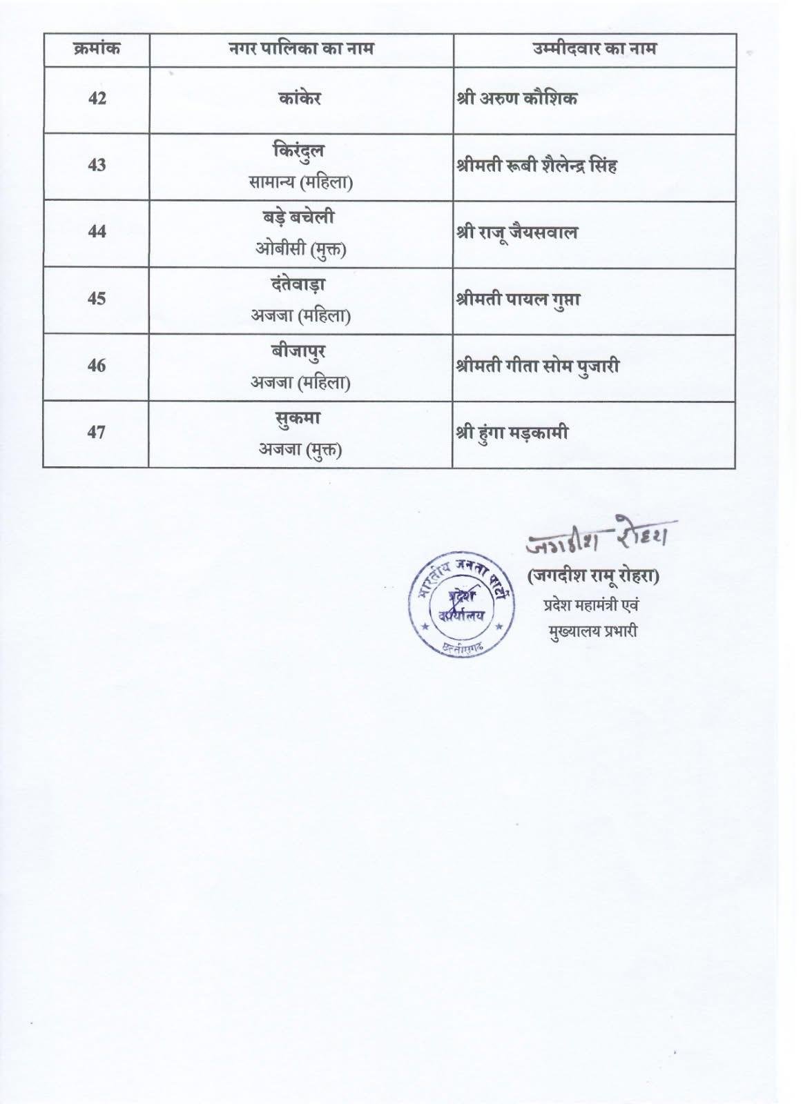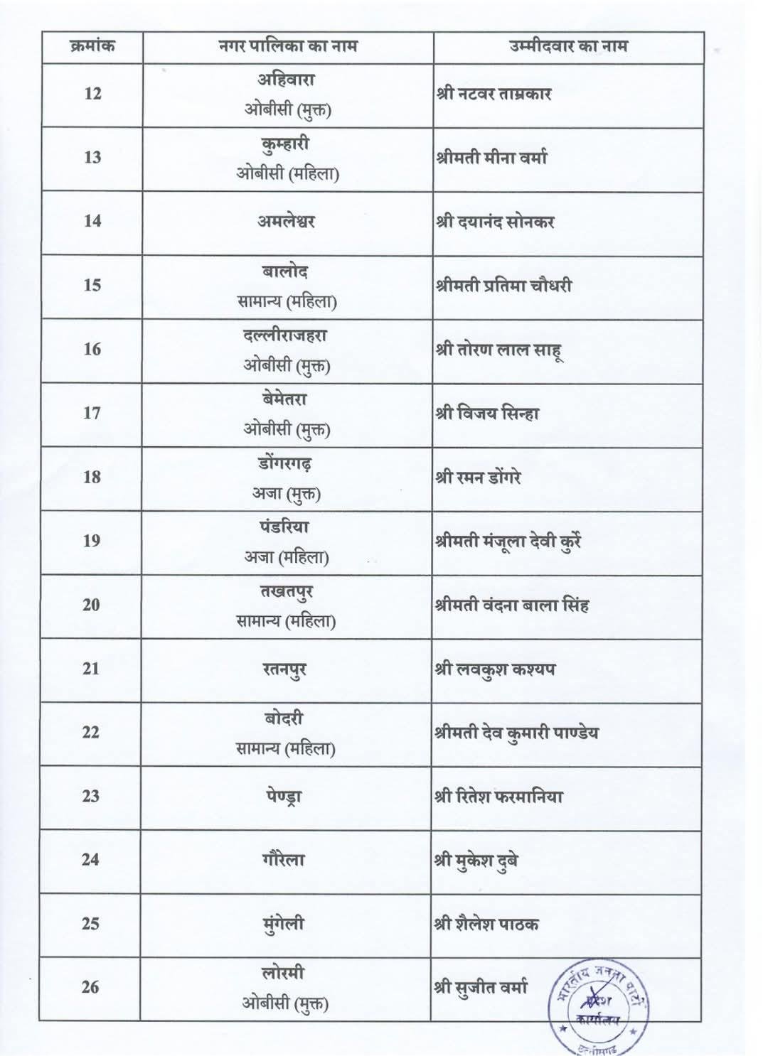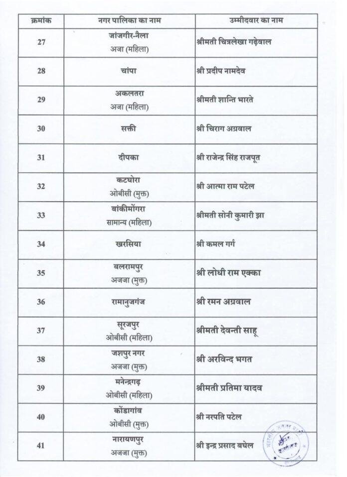 रायपुर: छत्तीसगढ़ की राजधानी रायपुर सहित राज्यभर में होने वाले आगामी नगर पालिका चुनावों को लेकर भाजपा ने अपनी रणनीति तेज कर दी है। पार्टी ने नगर पालिका अध्यक्ष पद के लिए प्रत्याशियों की सूची जारी कर दी है। रायपुर और इसके आसपास के क्षेत्रों में इस घोषणा के बाद राजनीतिक हलचल बढ़ गई है।