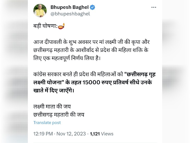 रायपुर.छत्तीसगढ़ में दिवाली के मौके पर मुख्यमंत्री भूपेश बघेल ने प्रदेश की महिलाओं को सालाना ₹15000 देने का ऐलान किया है। उन्होंने कहा है कि प्रदेश में कांग्रेस की सरकार बनने पर गृह लक्ष्मी योजना शुरू की जाएगी, जिसके तहत महिलाओं को यह रकम मिलेगी।