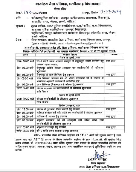 **रायपुर:** छत्तीसगढ़ विधानसभा के नेता प्रतिपक्ष, माननीय डॉ. चरणदास महंत, 18 से 20 जुलाई 2024 तक जिला कोरिया, कोरबा और सक्ती का दौरा करेंगे। इस दौरे के दौरान विशेष सुरक्षा और व्यवस्थाओं के इंतजाम किए गए हैं।