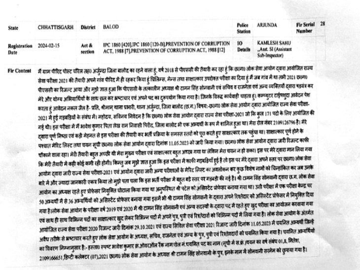 रायपुर.छत्तीसगढ़ लोक सेवा आयोग (सीजी पीएससी) की भर्ती में गड़बड़ी और भ्रष्टाचार के आरोप में तत्कालीन चेयरमैन टामन सिंह सोनवानी, सचिव, परीक्षा नियंत्रक समेत अधिकारियों और नेताओं पर बालोद के अर्जुंदा थाने में चारसौबीसी और भ्रष्टाचार पर एफआईआर दर्ज की गई है। पुलिस 2019 के बाद जितनी भी भर्ती परीक्षाएं हुईं हैं, उन सभी की जांच करेगी। पुलिस ने आरोपियों की तलाश भी शुरू कर दी है।