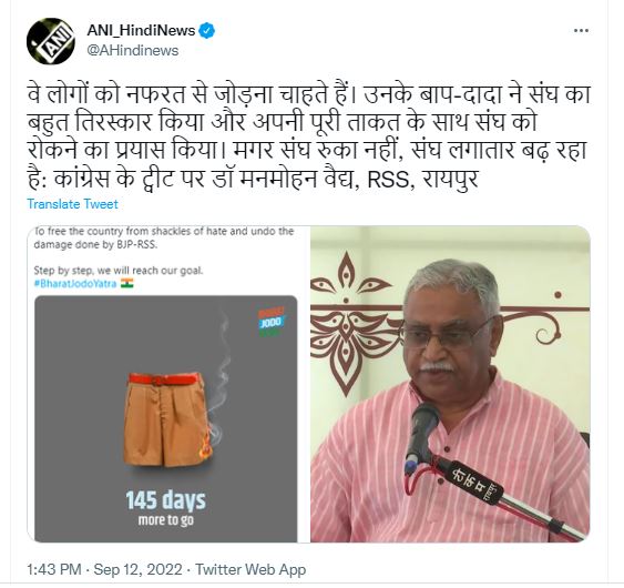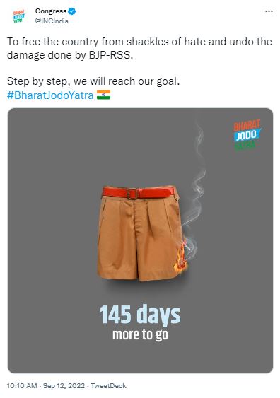 दरअसल, कांग्रेस की भारत जोड़ो यात्रा के पांचवें दिन (सोमवार को) पार्टी के ऑफिशियल ट्विटर हैंडल से की गई एक पोस्ट में RSS के खाकी निक्कर को जलता हुआ दिखाया गया। साथ में कैप्शन था- ‘देश को नफरत के चंगुल से मुक्त कराने और भाजपा-RSS के डैमेज की भरपाई करने के हमारे लक्ष्य पर हम धीरे-धीरे पहुंच ही जाएंगे।’