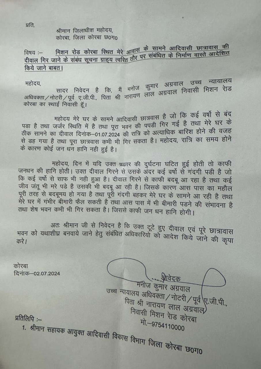 कोरबा, 02 जुलाई 2024 – कोरबा के मिशन रोड स्थित आदिवासी छात्रावास की दीवार गिर जाने की घटना ने स्थानीय निवासियों के बीच भय और संकट का माहौल पैदा कर दिया है। यह घटना 01 जुलाई 2024 की रात्रि को अत्याधिक बारिश के कारण घटित हुई, जिससे क्षेत्र में जनधन की हानि की संभावनाएं बढ़ गई हैं।